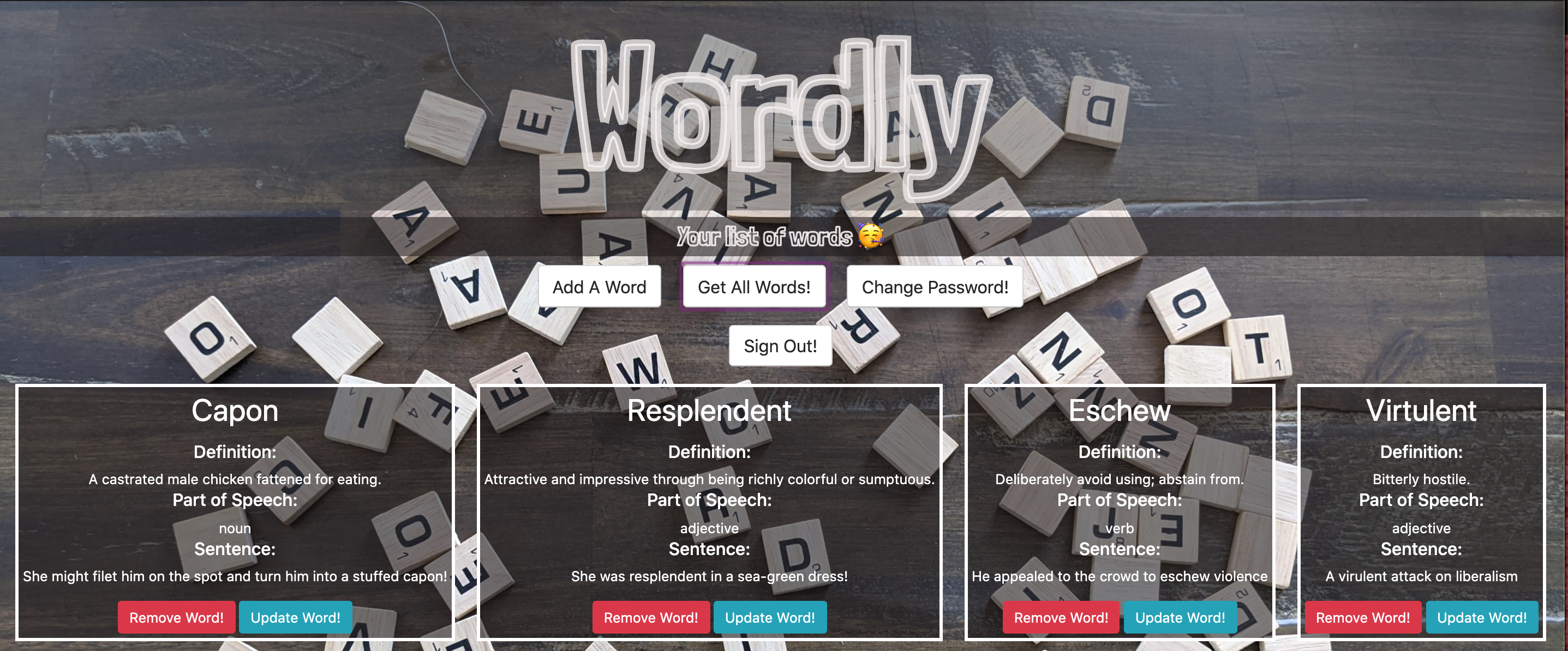 Wordly was created for people who would like to learn new words that they here in passing. They can store, edit and delete their words in their personal dictionary.